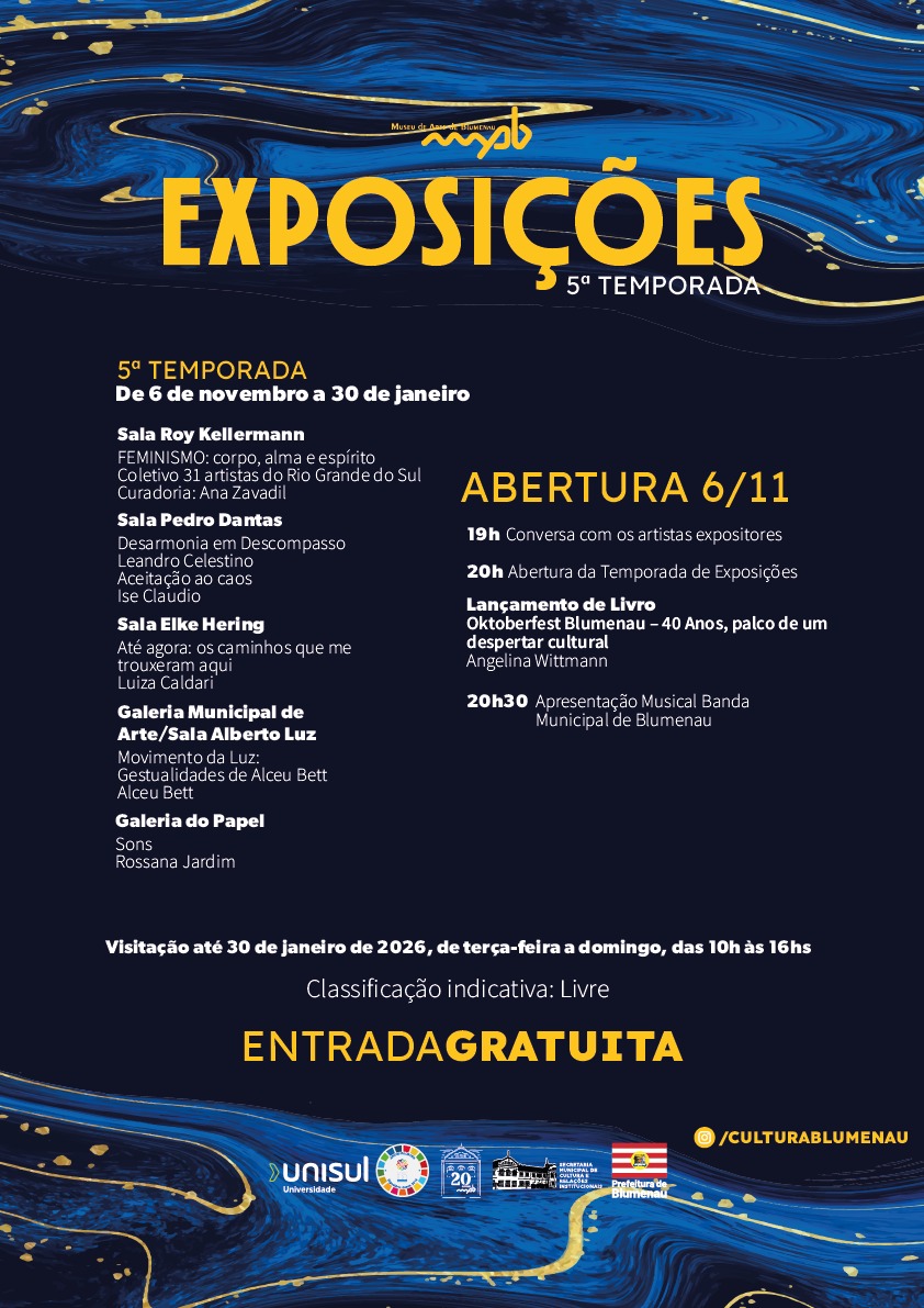 O Museu de Arte de Blumenau (MAB) realiza, no dia 6 de novembro de 2025, às 19h, a abertura da 5ª Temporada de Exposições, reunindo artistas de Santa Catarina, São Paulo, Goiás e Rio Grande do Sul,. A noite multicultural contará com a tradicional conversa com os artistas expositores e apresentação musical, e lançamento do livro Oktoberfest Blumenau – 40 Anos, palco de um despertar cultural” de autoria de Angelina Wittmann. A arte sendo celebrada em suas diversas linguagens.