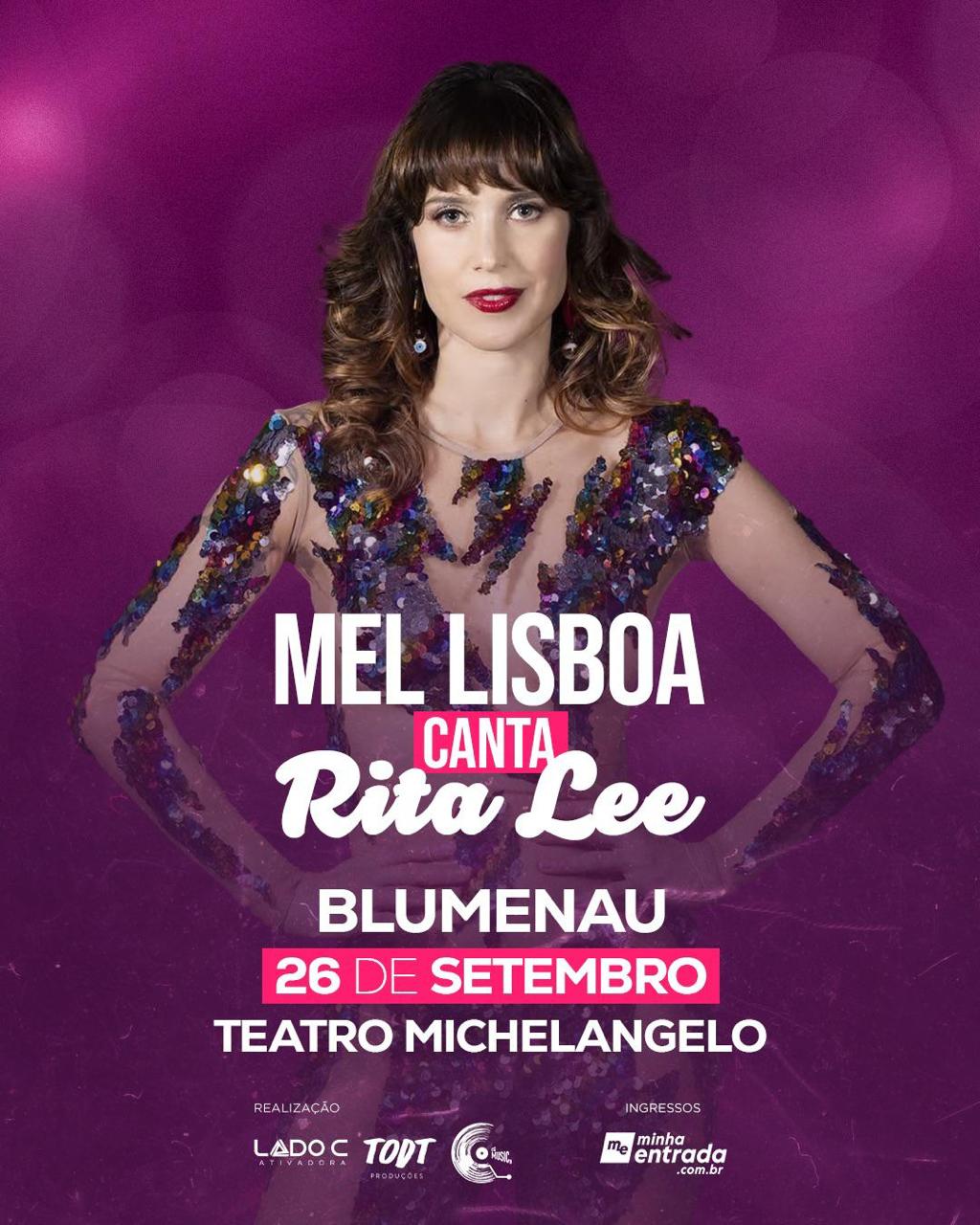 Mergulhada na experiência de interpretar Rita no teatro, a atriz e cantora preparou o show “Mel Lisboa Canta Rita Lee” que leva para todos os cantos do Brasil um tributo a uma das maiores artistas que esse país já produziu. Sempre exaltando a interpretação de Mel, a própria Rita disse um dia: “Mel, você me fez muito melhor do que eu mesma”. A intérprete, então, devolve o elogio numa homenagem apaixonada para aquela que até hoje é sua melhor e mais simbólica personagem.